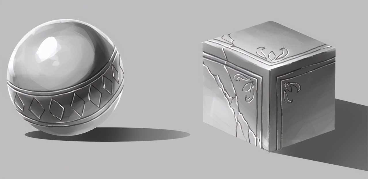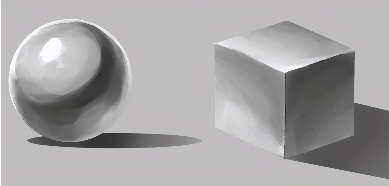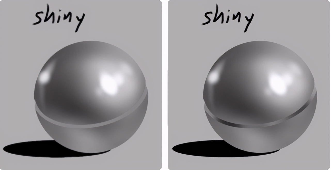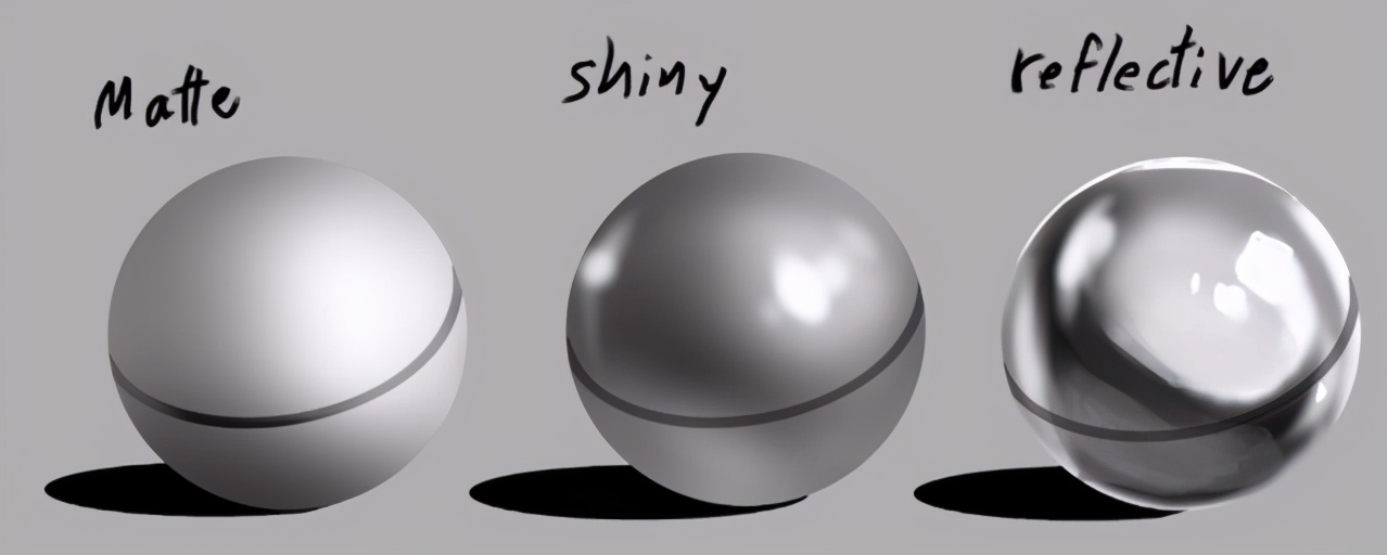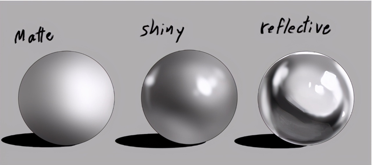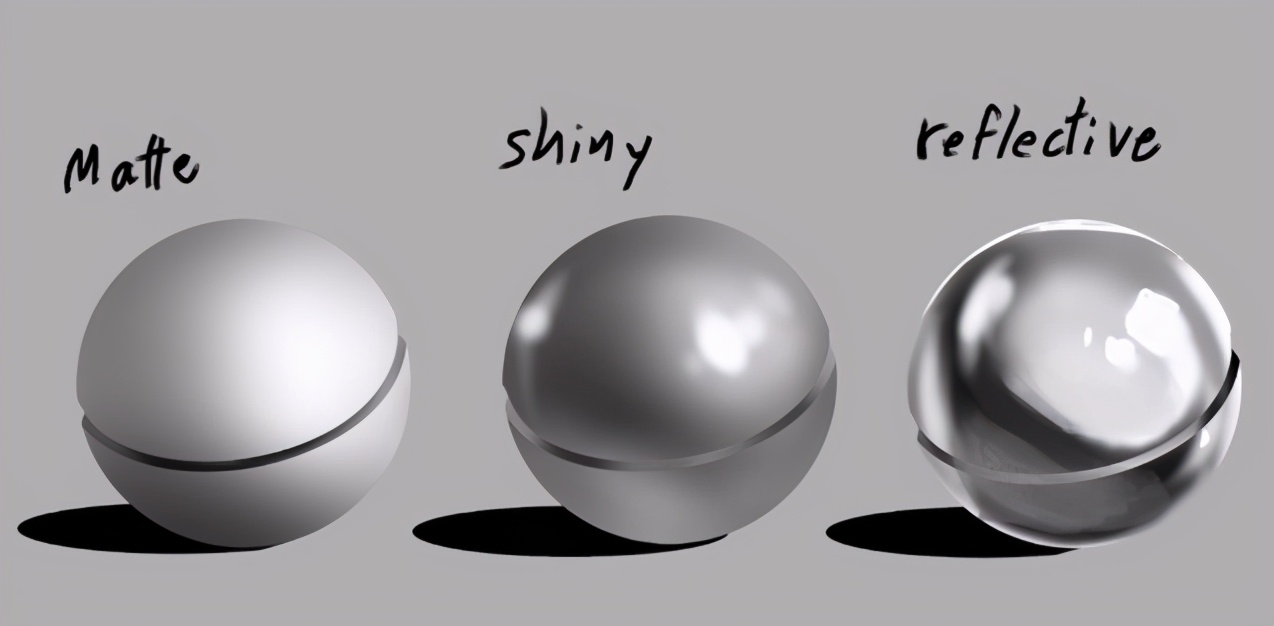 观察插图中央稍带光泽的球体就会注意到,在绘製带有光泽的材质时,用来区分它和雾面材质的要素是显眼的反射光,相较之下反光和本影的对比度也会显得更高、更锐利。