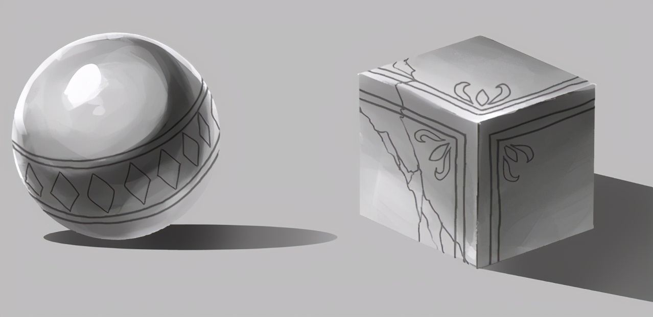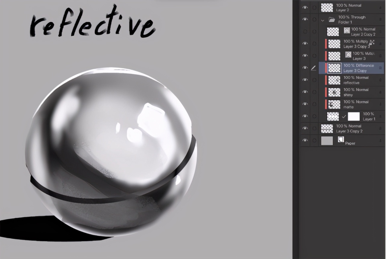 容易反射的材质表面会像镜子般,较清晰地映照出周围的模样,绘製的材质表面越容易发生反射,就需要加上越多周遭的颜色。
