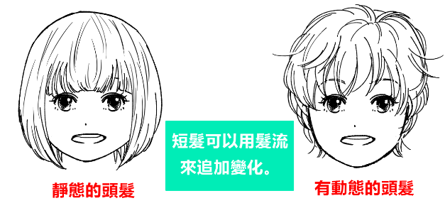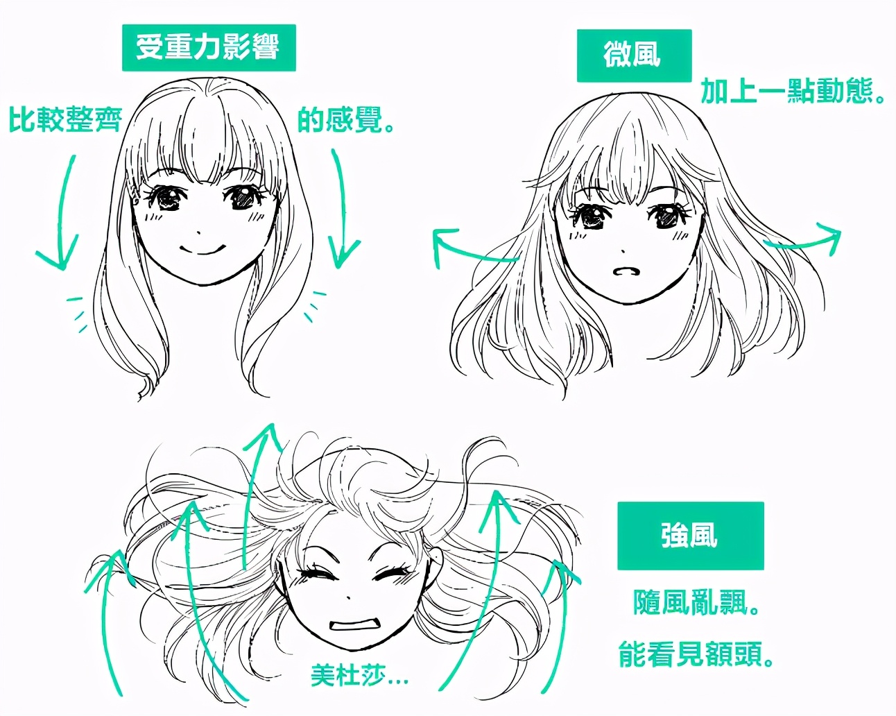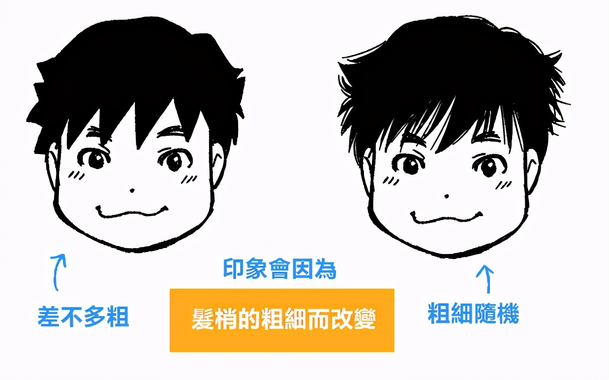 因为不容易受到重力影响,让头髮的一部份翘起来或是帮髮束加上一些变化,发型就会看来比较自然。如果沿着轮廓线清楚地画上去,会呈现看来像是头盔一样的发型,当然有些时候也可以刻意绘制这样的角色。