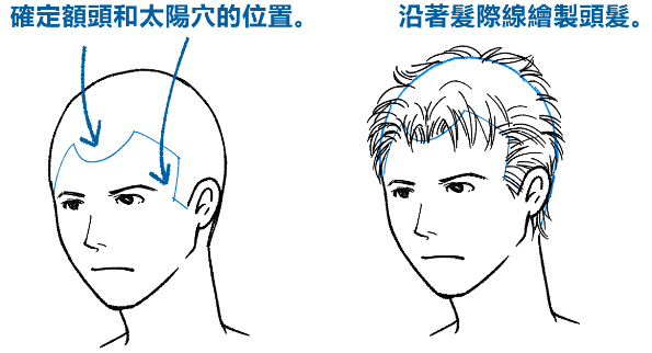 背头或露出额头的刺猬头是很有男人味的发型。在绘制这种发型时,可以先画出刘海的发线(除了额头上方外还有侧边的部分)再进行绘制。