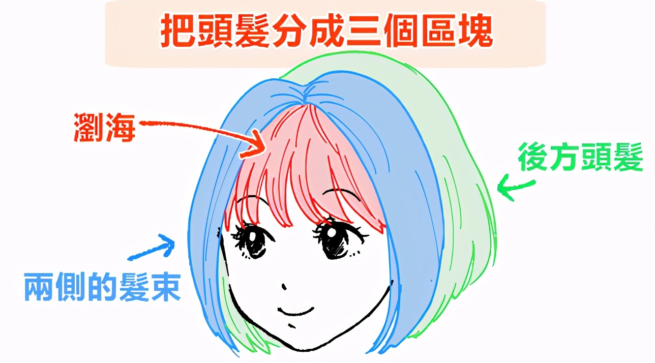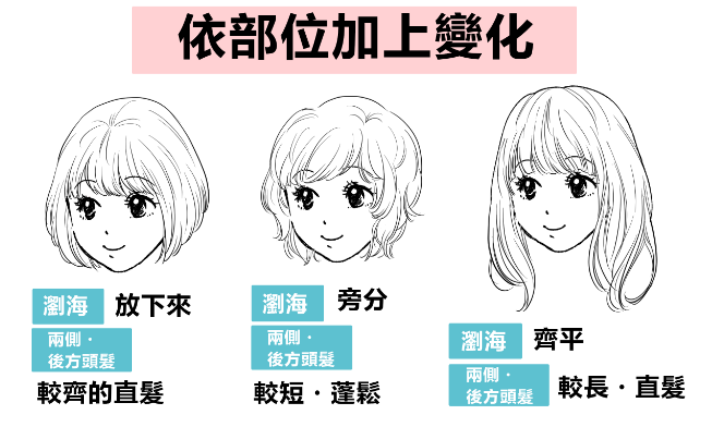 举例来说,帮这三个部分分别加上下述的变化,就能绘制出各种角色的头发。