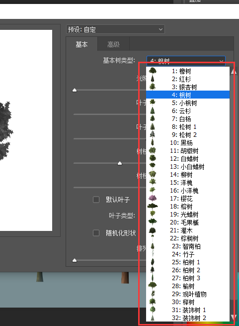 下拉你会看到这里有:橡树红杉银杏枫树小枫树云山白杨江直树等,总之这里有n款树任君挑选。