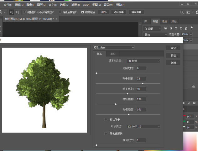 然后,这里的参数可以根据需要自己调节,可以调节树叶的疏密程度,也可以调节树干的粗细程度。