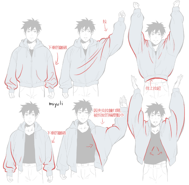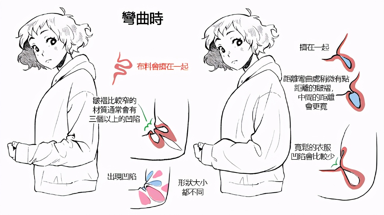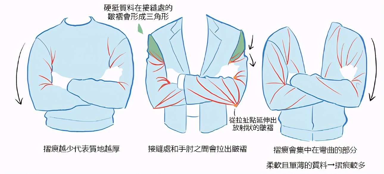 皱褶的形状会随著手臂的动作发生大幅度的变化。