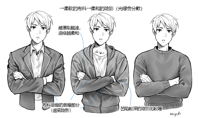 依质料不同,阴影(例如摺痕之间的宽度)在柔软阴影和亮部之间会发生变化,如果想追求更高的作品完成度,建议多多接触各种材质并加以研究,丰富自己的知识。