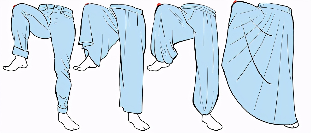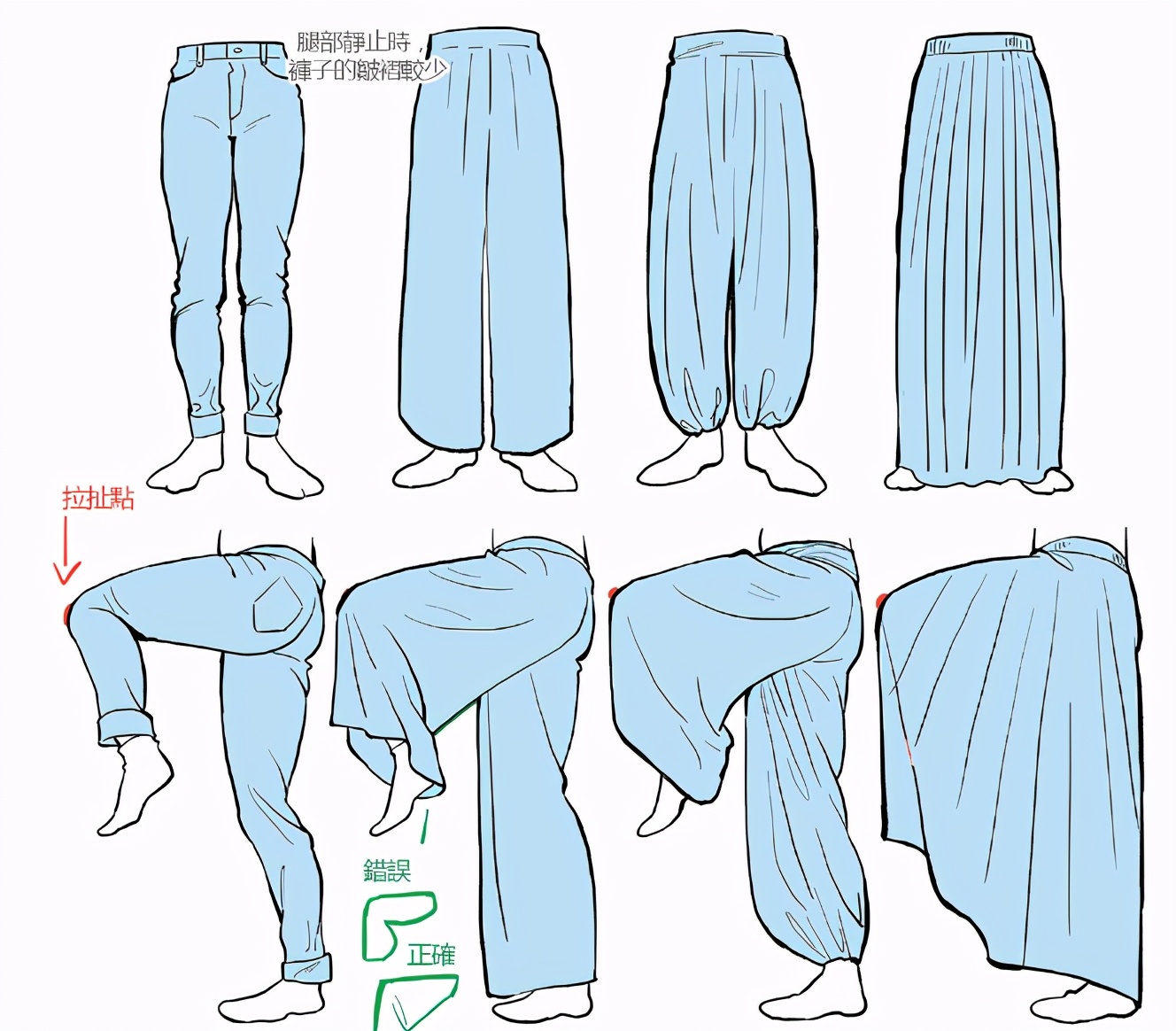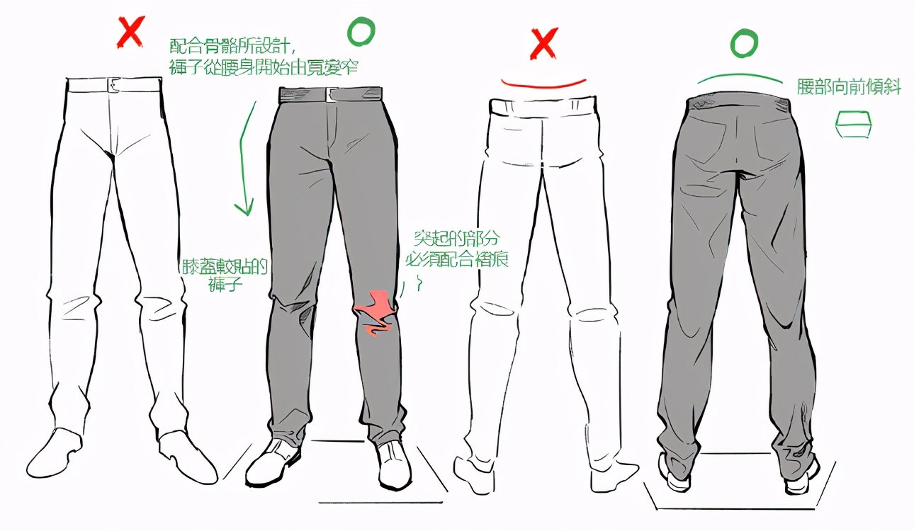 抬起腿时,膝盖会成为最强的拉扯点。请注意在移动腿的时候,裤子的布料会呈现什么样的形状。