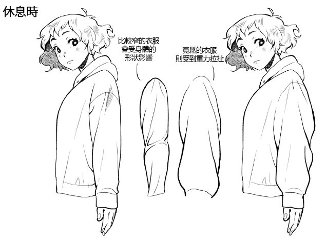 宽松衣服和贴身衣服产生的皱褶也不一样。贴身衣服的皱褶会沿著身体曲线发生变化,而宽松的衣服上较常出现从拉扯点朝地面下垂的皱褶。