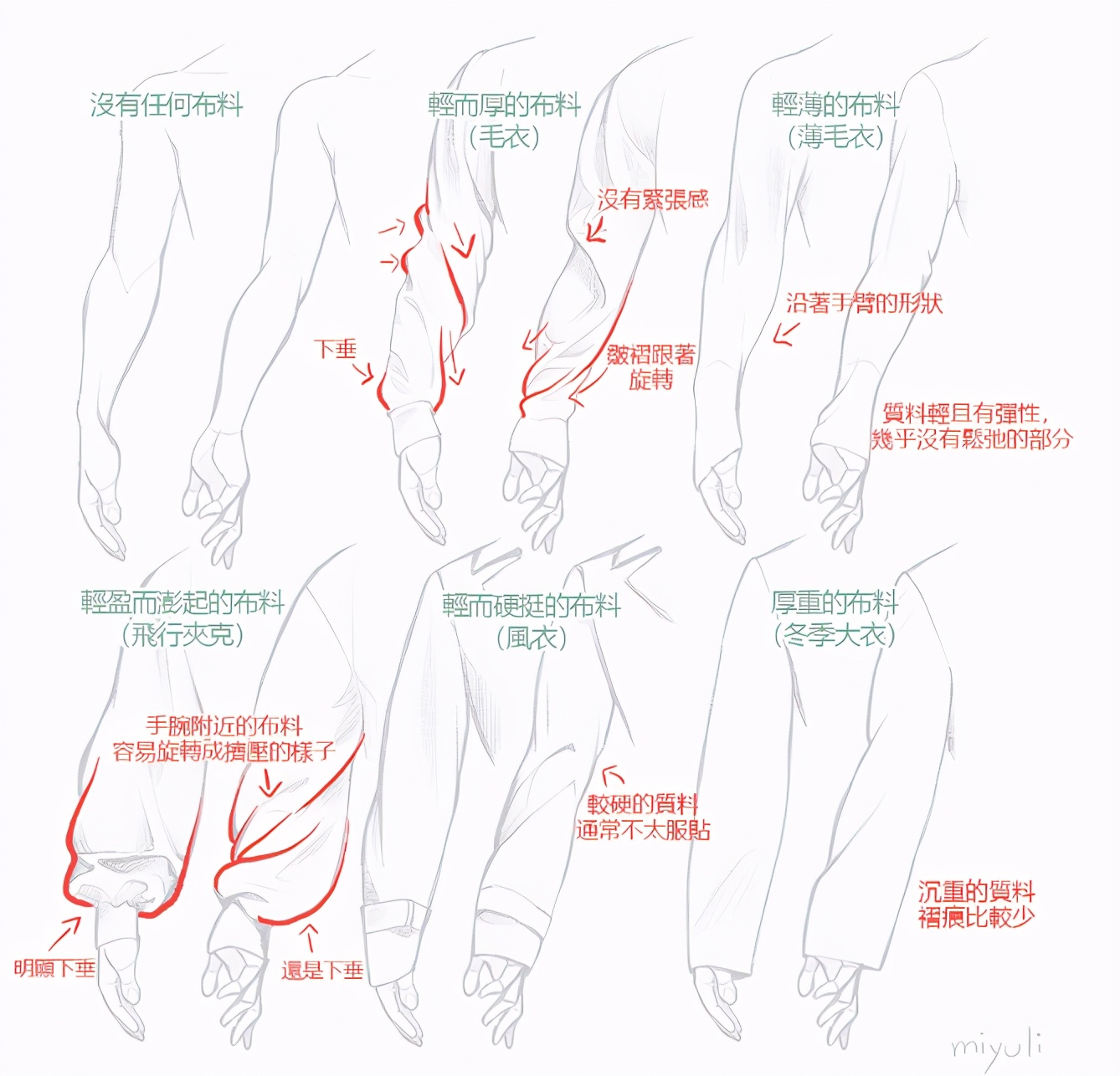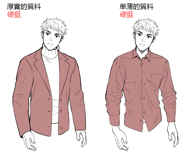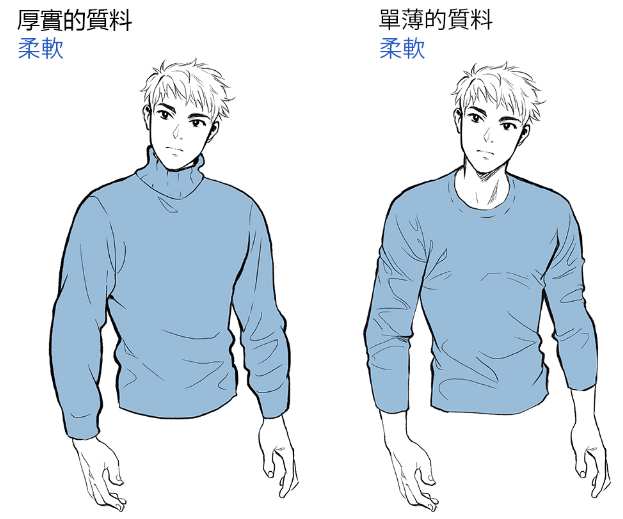 皱褶的多寡取决于布料重量和素材种类,在绘製布料时,建议首先考虑质料的「厚/薄」、「硬/软」、「重/轻」、「平滑/粗糙」。