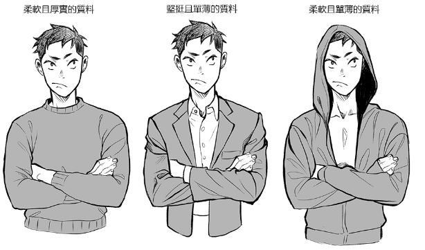 在绘制皱褶的时候,考虑布料的材质是一件非常重要的事情。每种质料都有它的特性,认识布料的材质有助于我们绘製出适当的摺痕位置,并想像皱褶产生的阴影会像什麽样子。