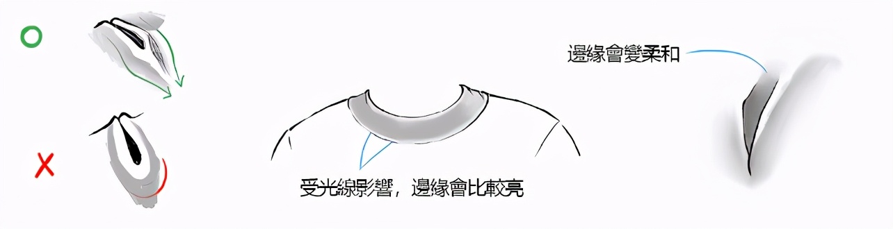 绘制皱褶的阴影时,要区分使用柔和的阴影边缘和尖锐的阴影边缘。