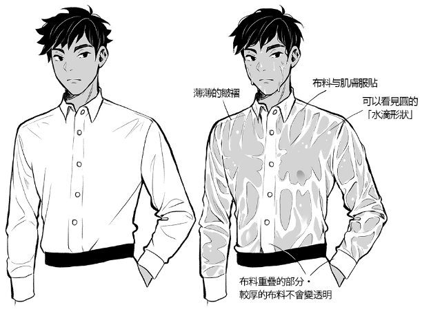 湿润布料产生皱褶的方式与干燥的布料不同,布料倾向于服贴在肌肤上。原本较轻的布料会因为吸水而加重,变得不太容易移动,而较薄的布料还会呈现出透明的样子。