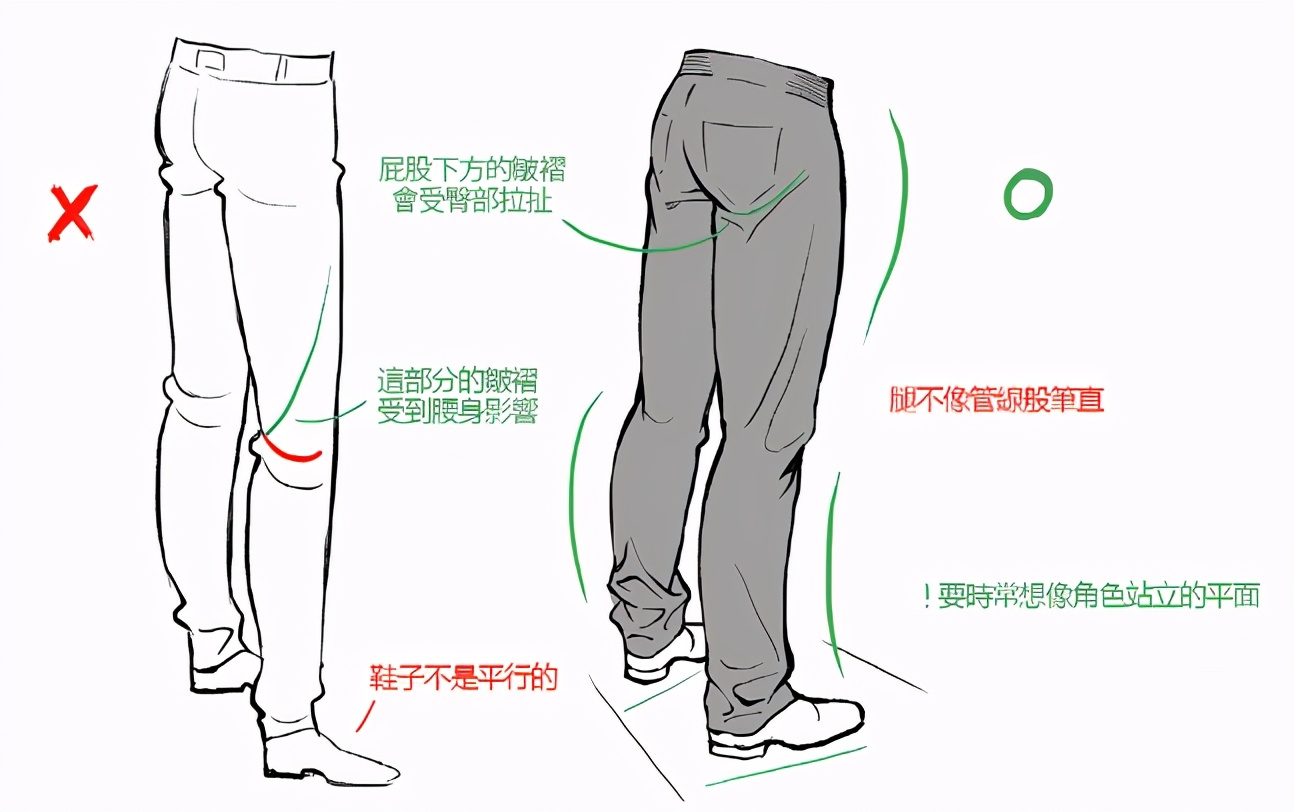 从背面来看,臀部下方形成的皱褶摺痕会向腰部延伸,膝盖部分形成的皱褶也会明显地拉向腰身。通常在人站著休息时,比较不会形成动态的皱褶。