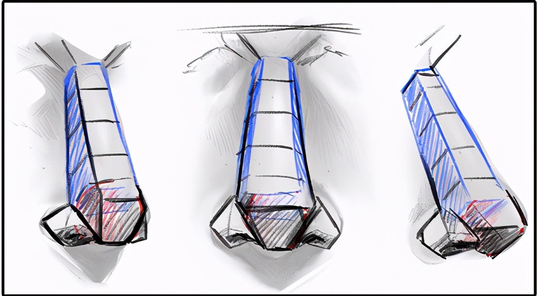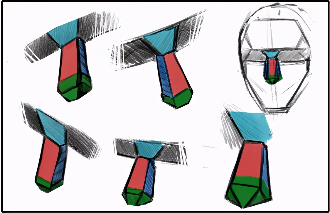 请想像组成鼻子的各种基础形状,并试著分解它们。使用扁平的长方形可以帮助我们理解鼻子的立体形态。