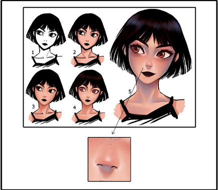在这篇教学的最后,让我们一起看看绘制下方插图的步骤,这应该能帮助了解构成脸部的其他要素和鼻子之间是如何组合的。
