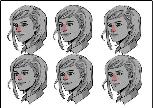 在下面的范例中,我帮上排的三个角色绘制了显眼的鼻子,帮下面三个角色绘制了小而尖的鼻子。如图所示,角色的个性(鼻子等)和身体特征有著紧密的连结,但也总会有例外。