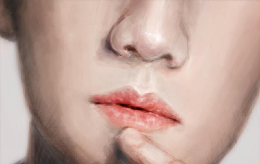 我总是会帮鼻子下方画上暗的阴影,并把鼻孔侧面和鼻尖画亮。配合角色的固有色,插图的颜色会因为照明发生很大的变化。在我的想象裡,这张图使用的是中性的光源。