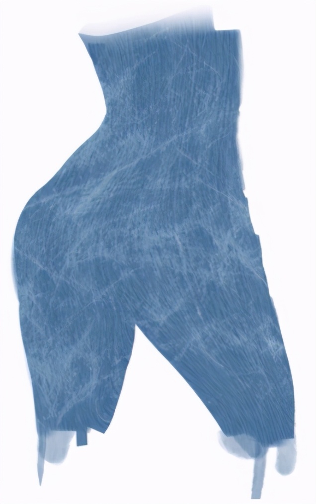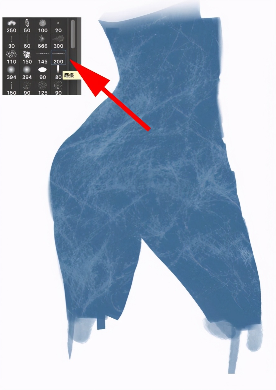 第一步:遇一佃中间调的灰蓝色,画出想要绘制的牛仔裤臀部的造型,再选一个彩度低的浅蓝灰色用我笔刷里的200号笔刷随意的画出一些肌理