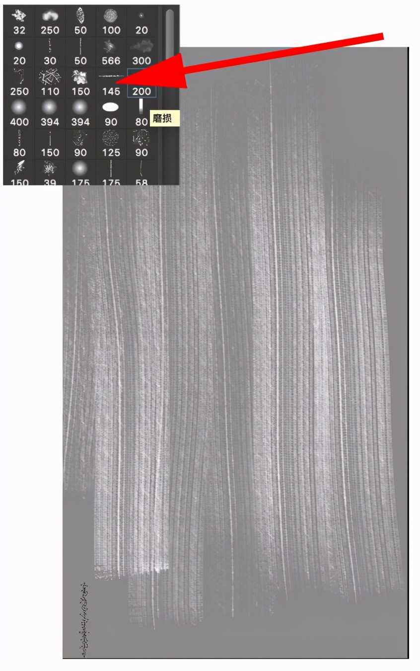 第二步:新建立一个图层填充灰色,用145号笔刷随意的突出如画一样的拉丝一样的肌理