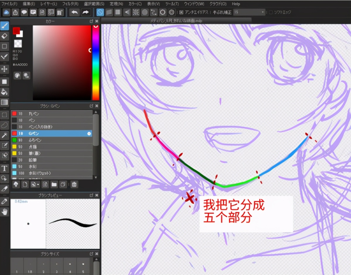 我试着把人物的脸部轮廓画成5个部分(为了方便看清,我把颜色改了)。