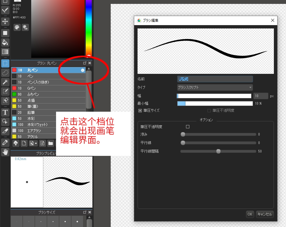 点击将光标悬停在钢笔工具上时出现的齿轮符号,打开下面的界面。