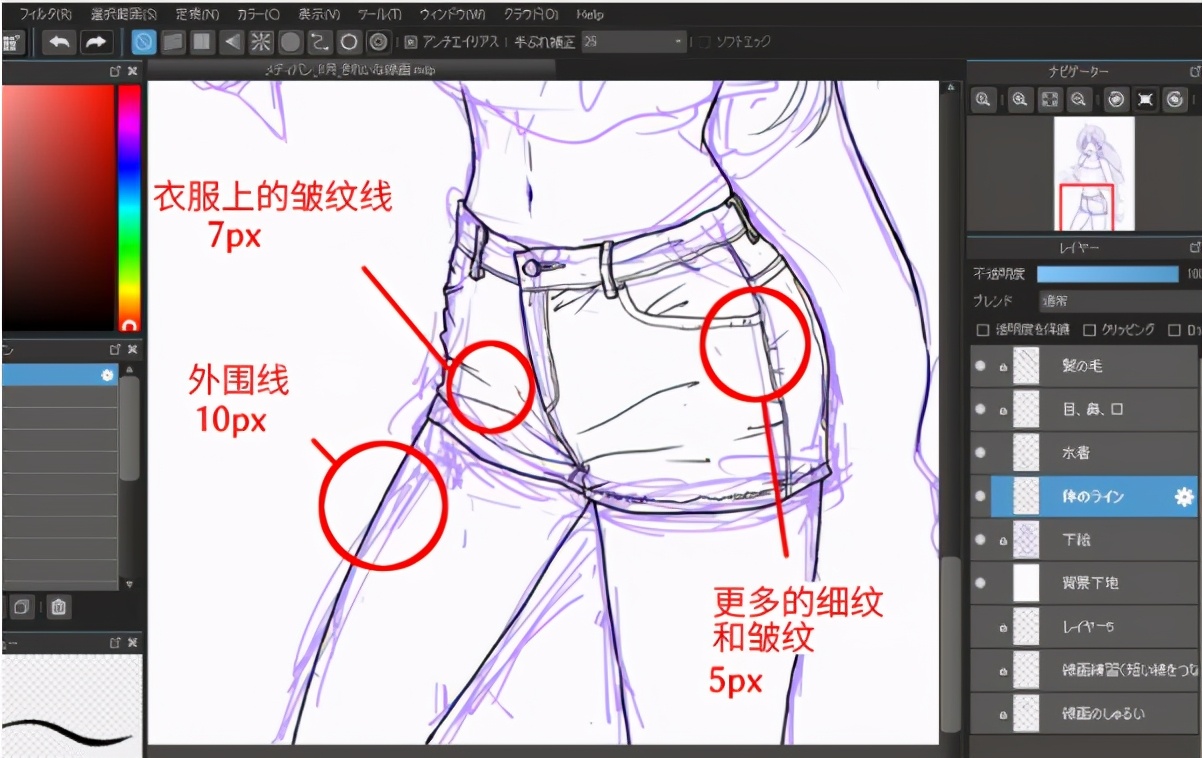 针对不同的部位,如脸部轮廓、身体、衣服的皱纹、眼睛的表情等,使用不同粗细的线条。