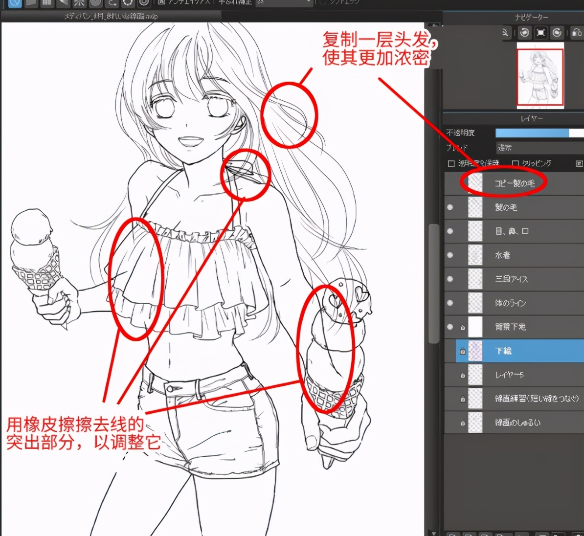 为了把分别画在图层中的线描图合并成一张图,我用橡皮擦擦掉了溢出的部分。