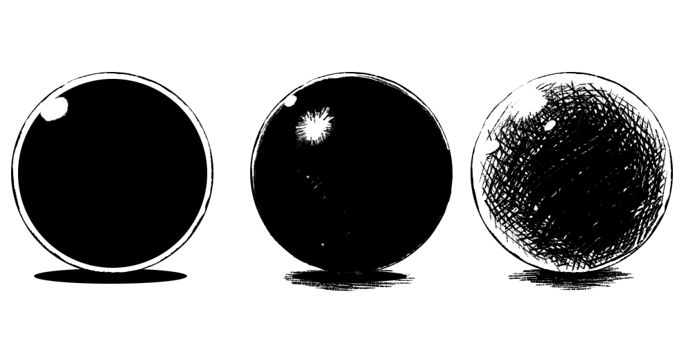 在绘製柔软的物体时要使用柔软的笔触,在绘製坚硬的物体时则使用较坚硬的笔触。这些都是在单纯欣赏图画的情况下不会去注意的事情。