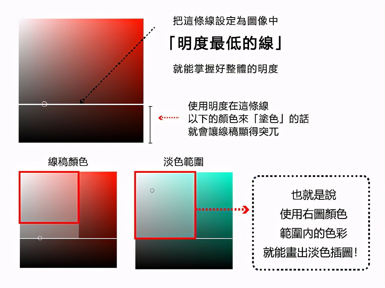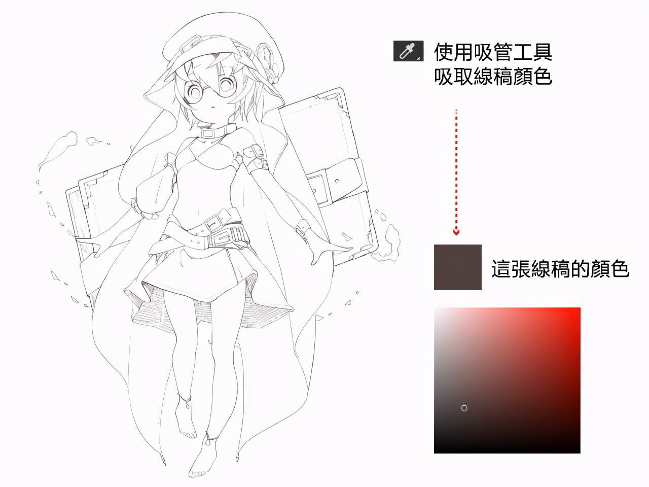 这时候可以选择跟线稿颜色相较起来「明度不会显得更低」的颜色来稍微涂上。
