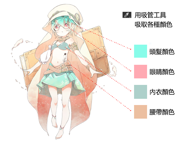 我用吸管工具吸取了插图中女孩子的「头发」、「眼睛」、「腰带」颜色,分别是以下图像中的各种色彩。