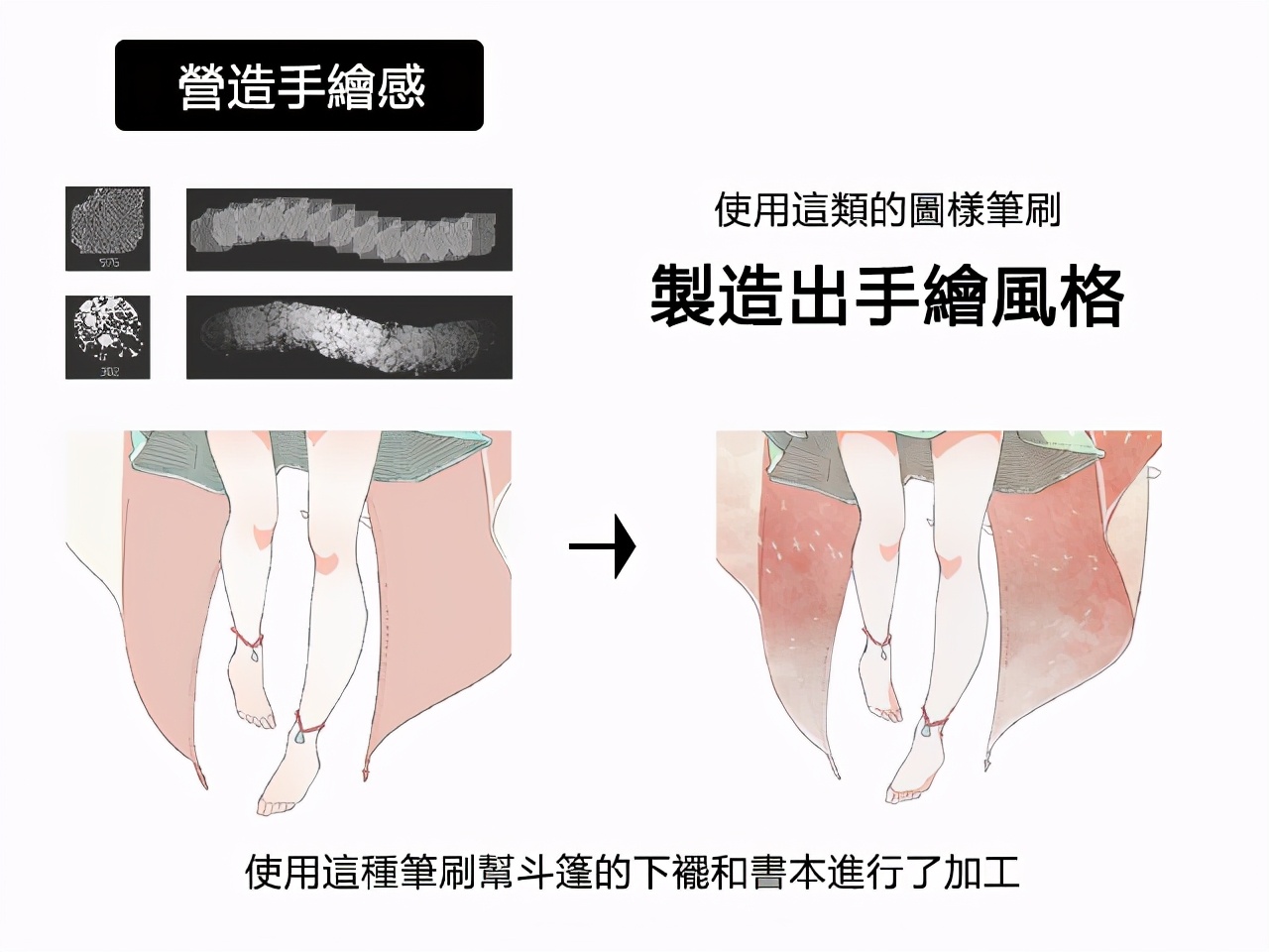使用基础的「材质」或「图样笔刷」来进行手绘加工应该就行了。