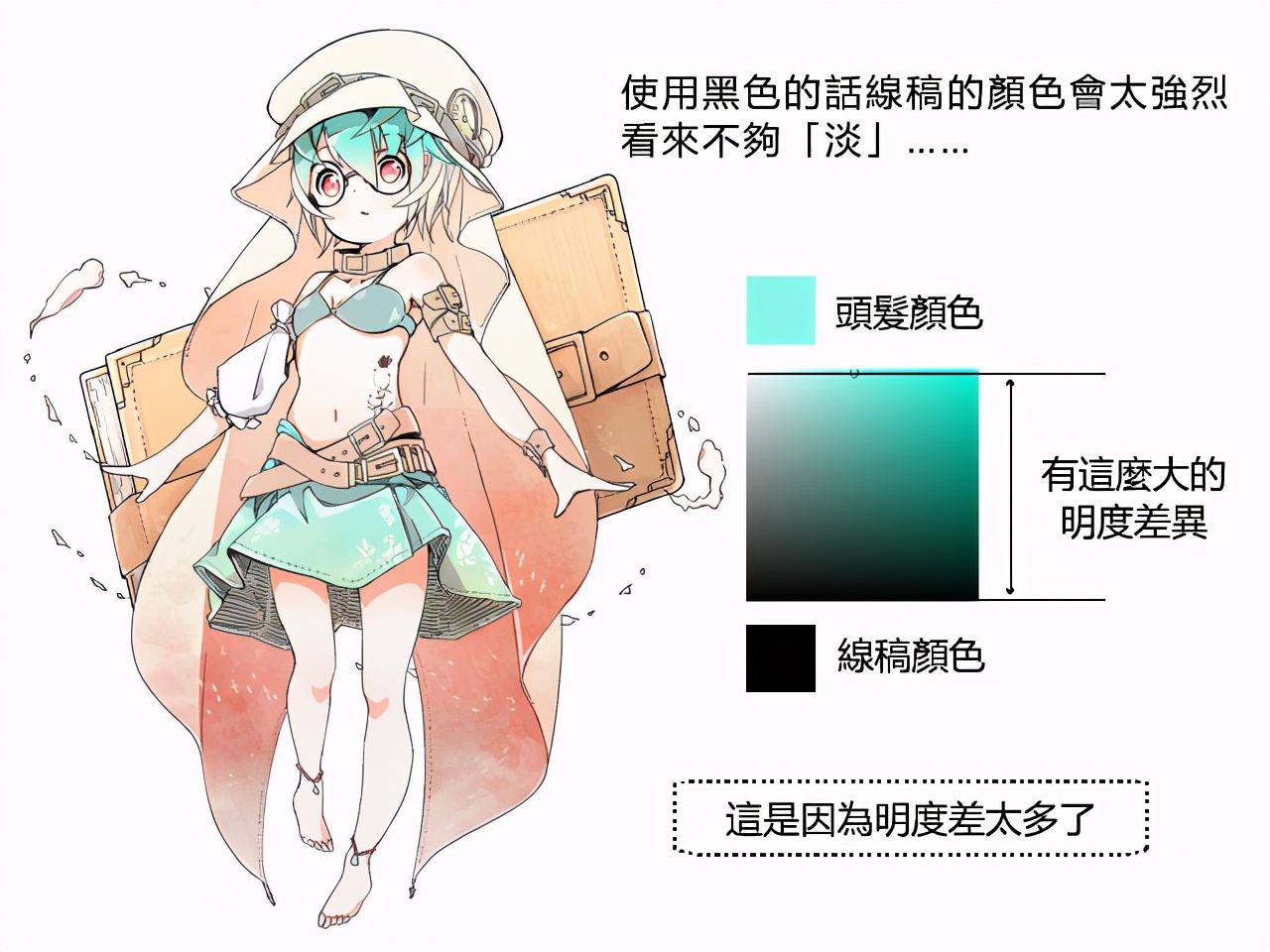 但在使用高明度、高彩度的「淡色」涂色方法时,若以低明度的「黑色」来绘製线稿,会因为明度差异太大而显得突兀。