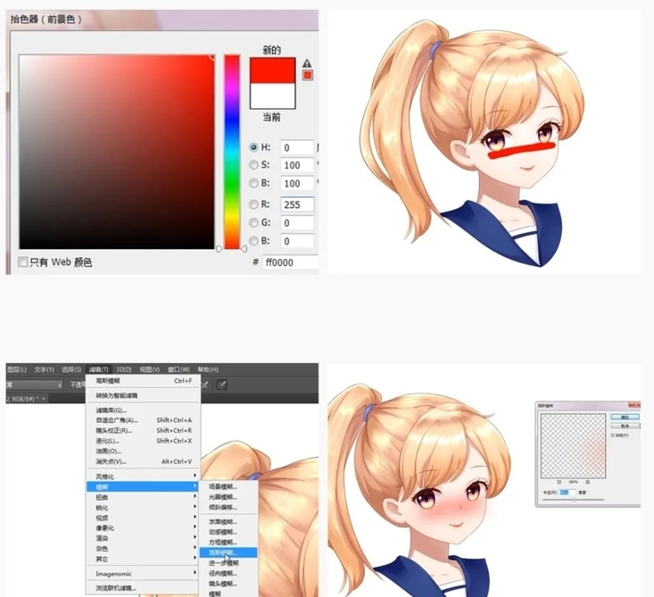 先说个最万能的,直接大红色上去,然后用刚刚说的高斯模糊晕开它,再按自己需求调整不透明度即可