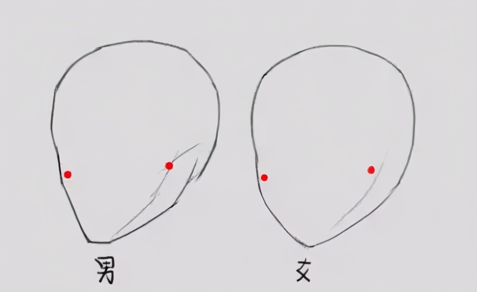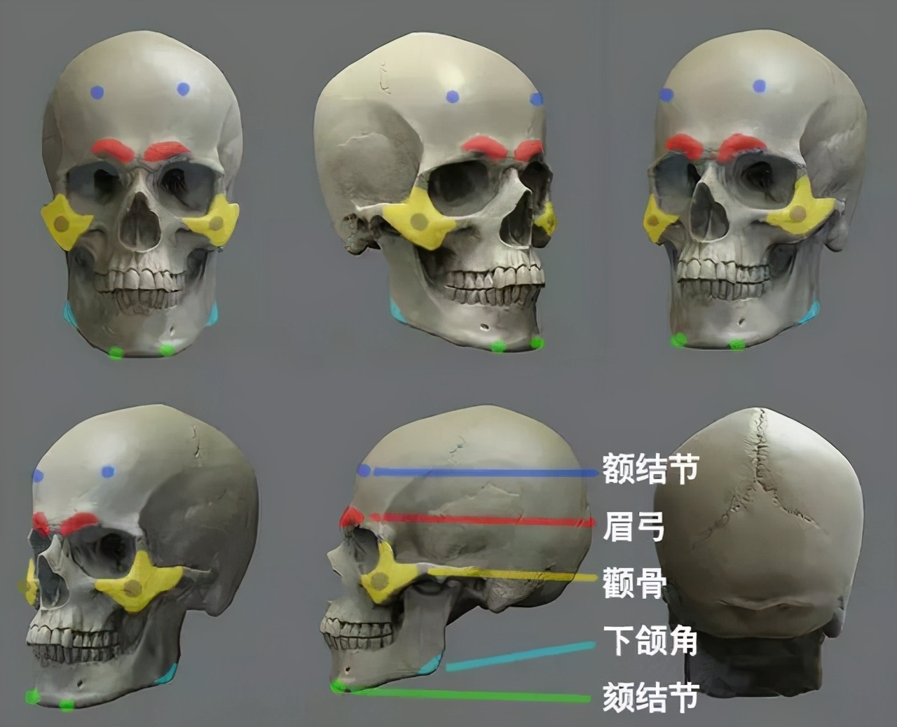蓝点额结节:在额头正面和侧面的转折处,正面看不会太明显,但微侧和侧面看就很凸出,可以理解为头骨前面和上面的分界(注意绘画讲究美感,画女性头像需要尽可能弱化这个节点,微微的有就好)