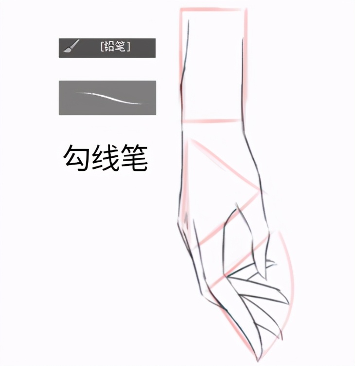 通过几何的定位,可以看到扇形的弧度和关节的位置,三角形和手掌的位置,然后用线条勾勒,这里初学者勾的时候可以多勾几次,注意比例。