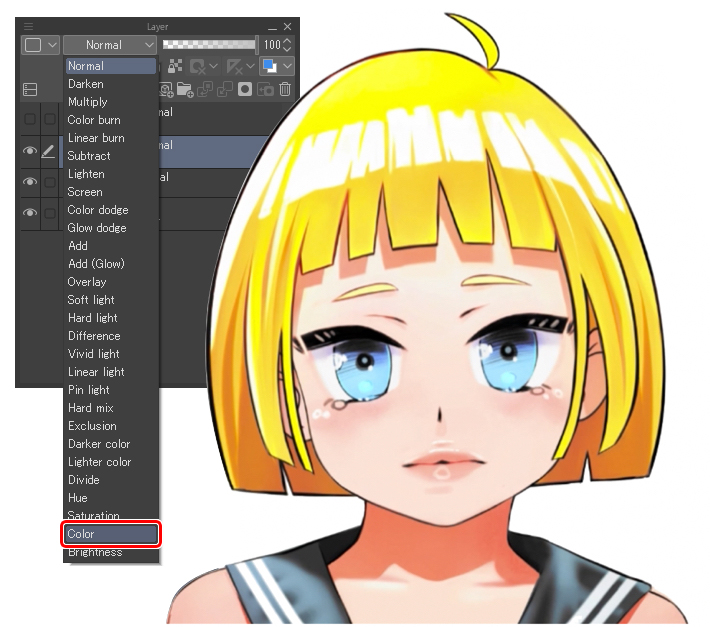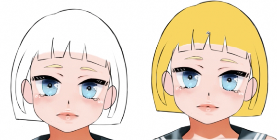 这一次,绘制线在开始绘制头发时消失,因此将花费更少的时间进行修剪。与卡通样式不同,线条不希望总是可见。完成绘制后,将线颜色更改为深橙色。这样,与原始的黑色线条不同,轮廓更容易与头发的黄色色调混合。