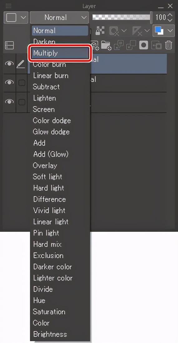 我喜欢从阴影开始。首先,在下拉列表中创建一个新图层,将其更改为“乘积”合成模式,并填充要显示阴影的区域。此设置是使图片变暗的最佳方法,因为在绘画时不会像普通图层那样隐藏其下面的图片。这是因为将下面的图层颜色与正在设置的图层颜色相乘,使颜色比原始颜色暗。