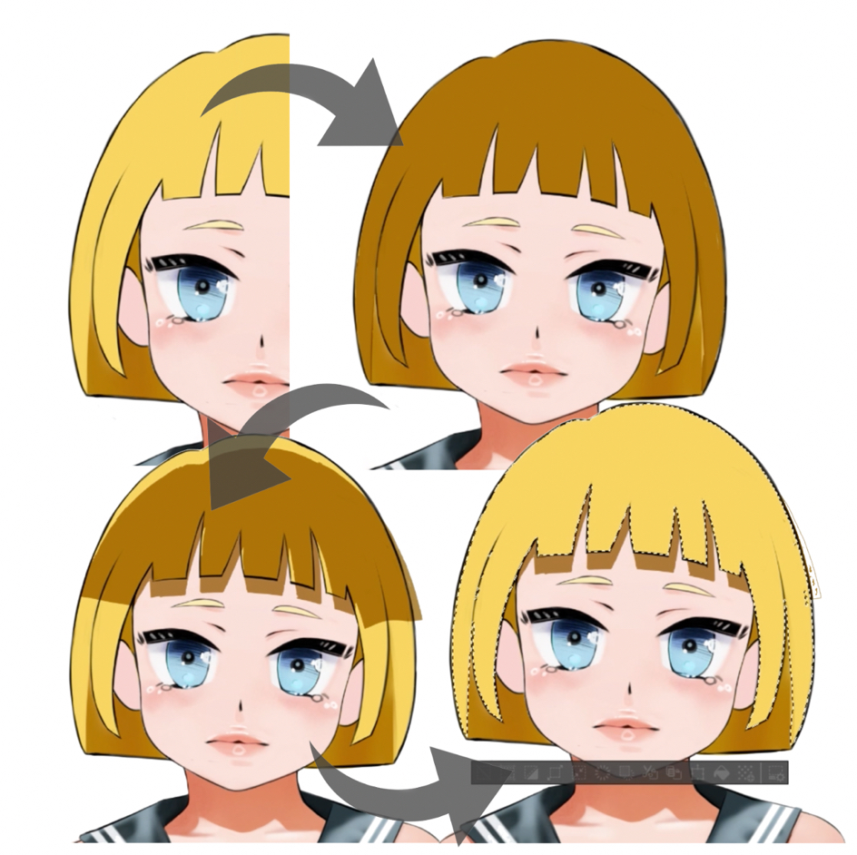 而且发型似乎太简单了,我画了更多的股子,让它看起来很好看。只画了一个,但为了节省时间,复制并粘贴刚刚绘制的部分,并使用“左右翻转”将其放置在图的右侧。对网格进行变形,以打破对称,使其看起来更动态。