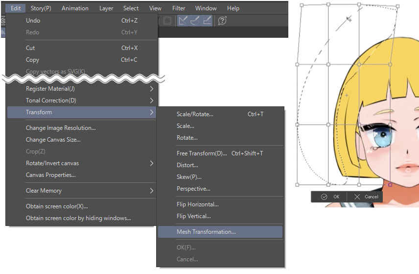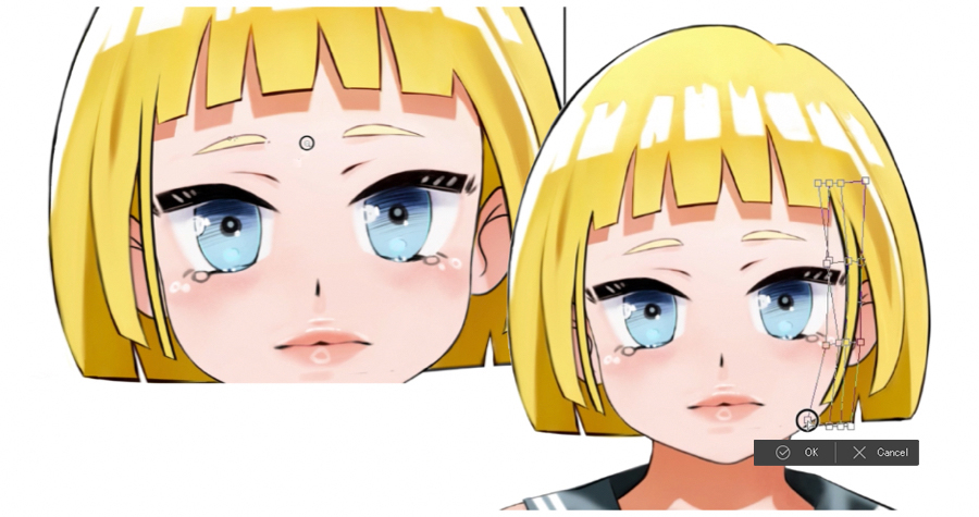 我发现我不太喜欢头发的形状。所以说,‘“圈套”在工具中,复制并粘贴要修改的区域,然后单击“网格变形‘工具已适当调整选定区域的外观。然后,在将毛发层与包含面孔的图片的主要部分层合并之前,清除不必要的部分。