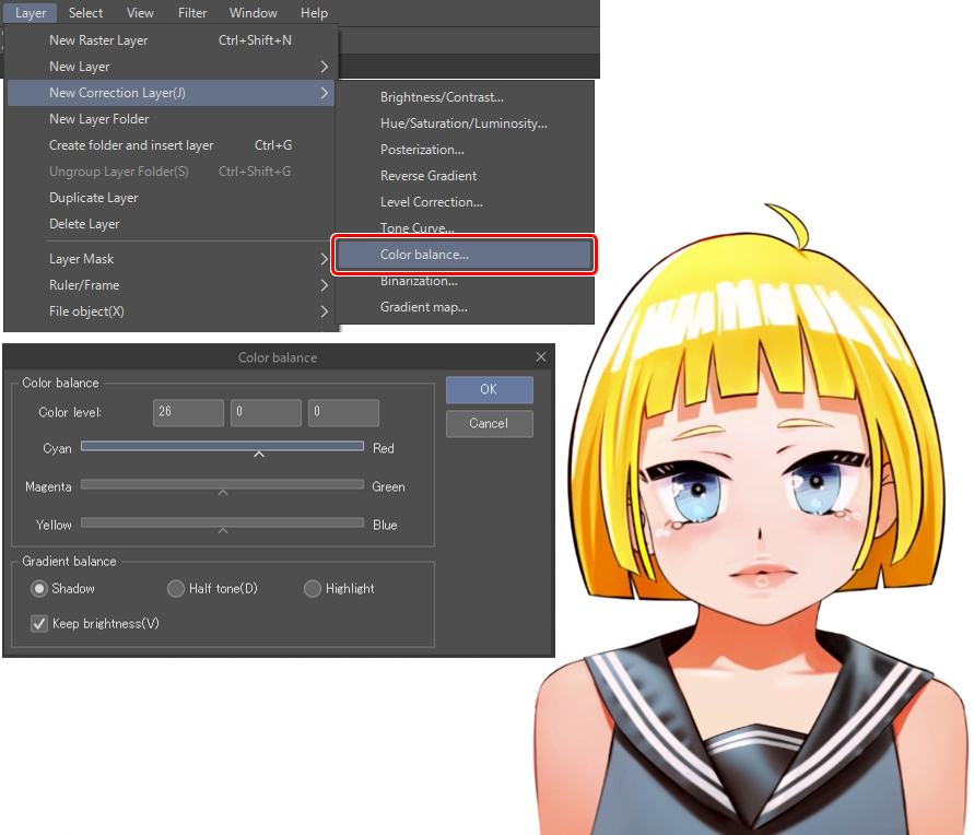第二个要领是“颜色平衡([层] > [新色调校正层] > [颜色平衡]),您可以使用它来调整西安、洋红色和黄色。调整设置,直到找到适合地物的平衡。