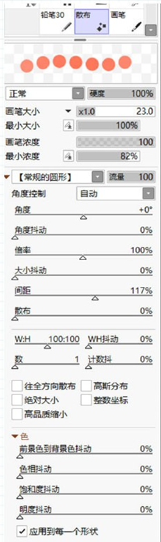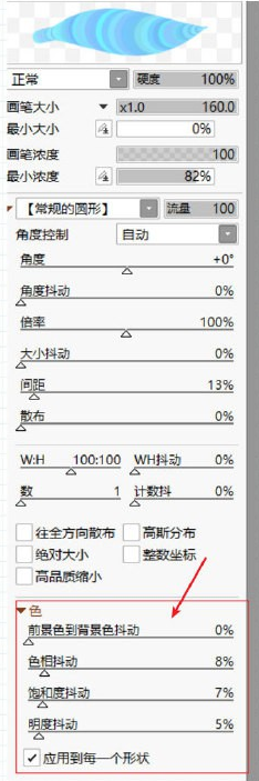 间距调低,“色”那部分的数据调一调也可以当做是丰富画面色彩的笔刷使用一般用的比较多是色相抖动