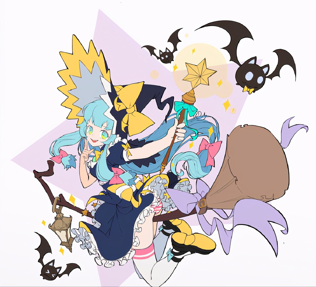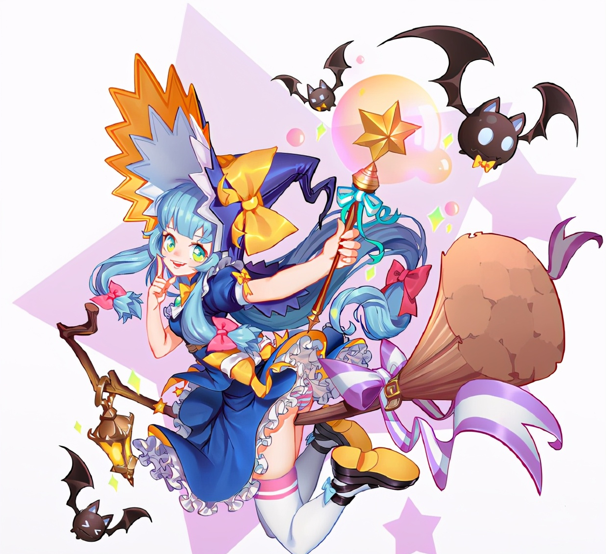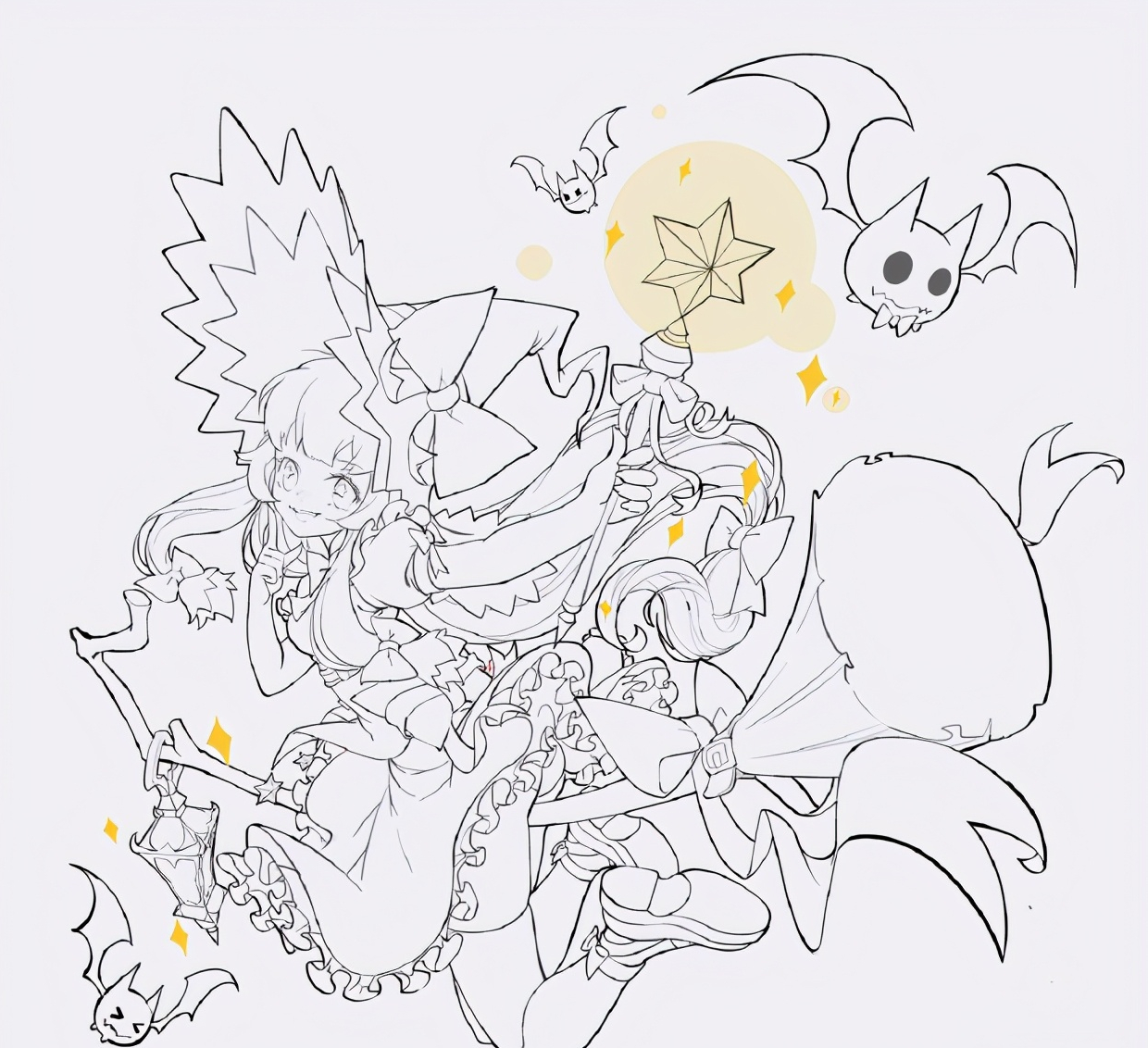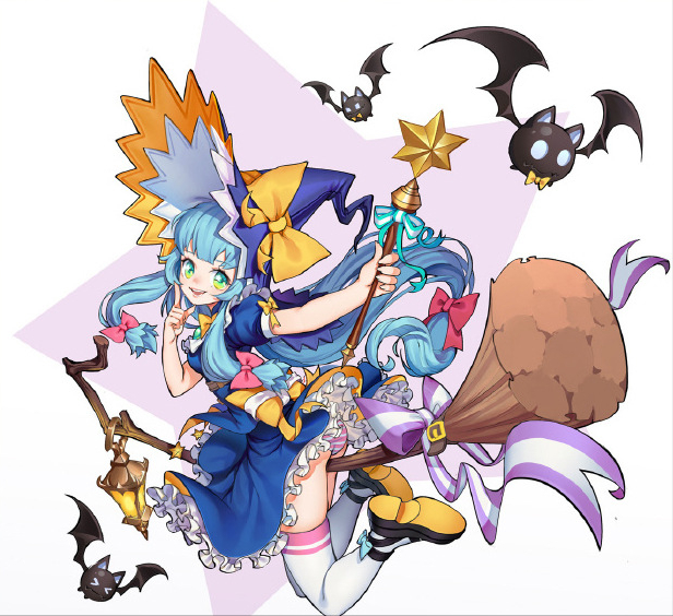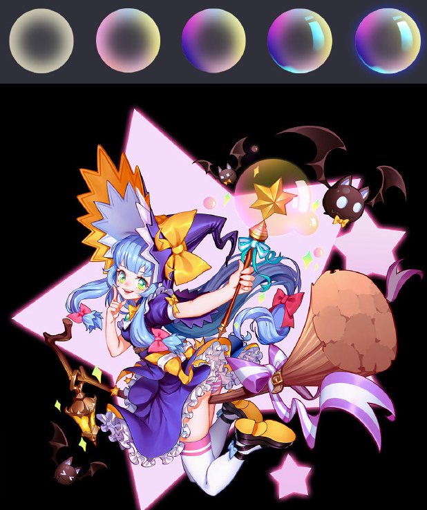 进行亮部细节处理,就是加高光啦。之前的亮部细节刻画颜色处理的还是比较灰,这里整体提高一下亮部的饱和度,注意只是是亮部的饱和度哦,比如头发、裙摆、扫帚等。可以通过图层属性:线性减淡,用喷枪画一下亮部。