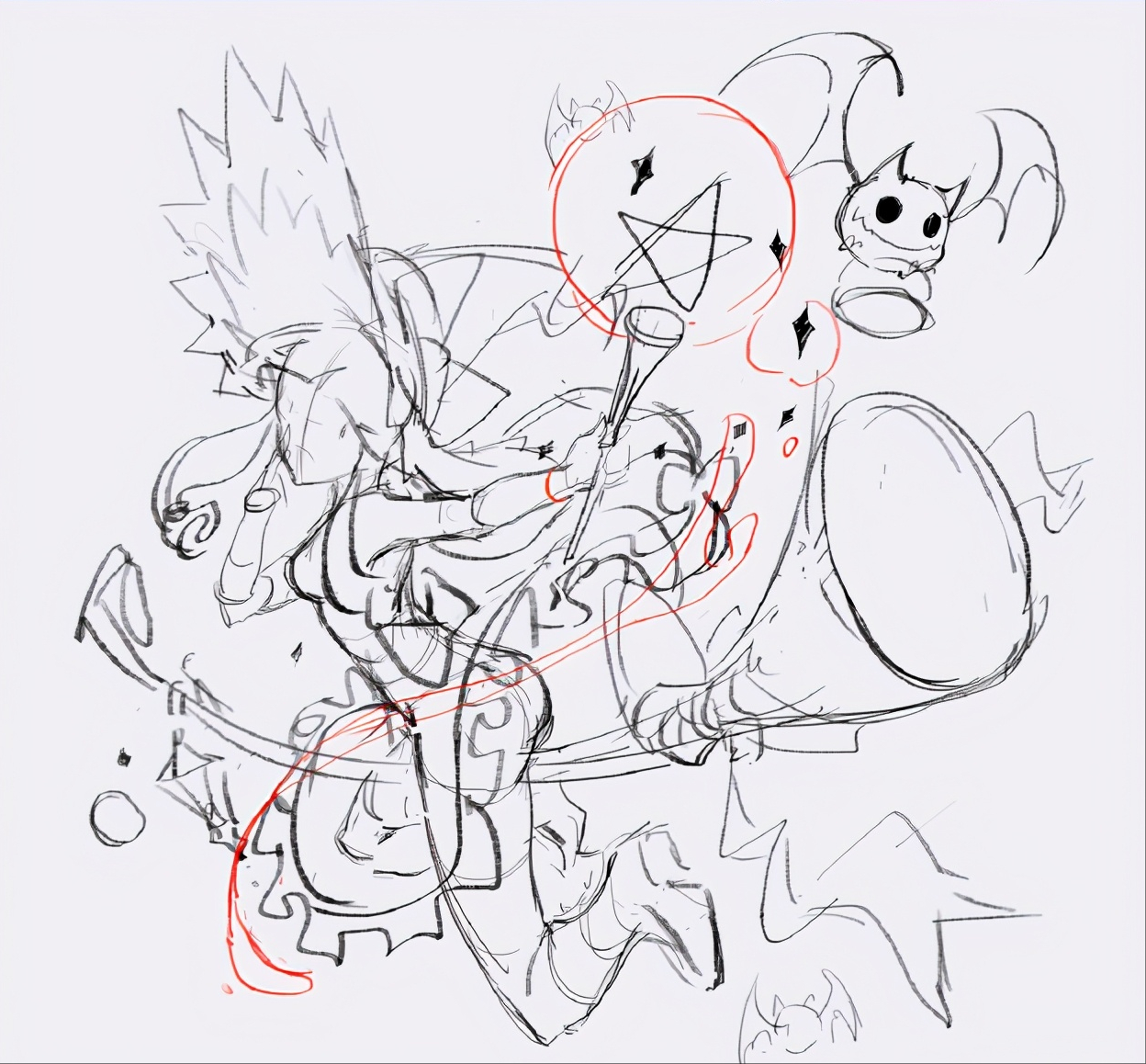 基本的人物造型确定之后,加一些背景物件,注意近大远小的透视关系,这里加了一些小蝙蝠作为丰富画面的物件,当然还可以想一些其他的设