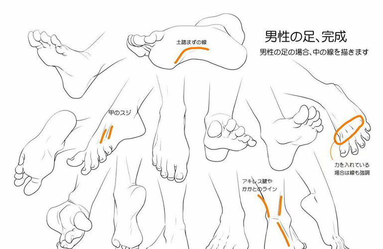 仔细观察这些男士的脚,可以发现脚底部位上脚掌和下脚掌是向外张,而脚掌心是向内收拢的。男性脚的画法,线条表现起伏要更大些。
