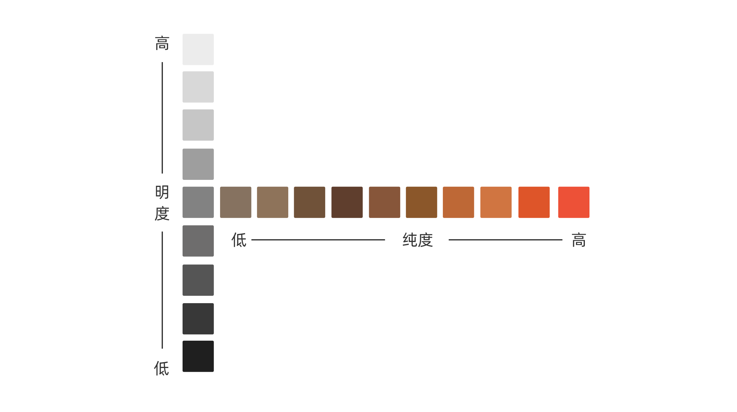 我们看到下图中,位于纯度最右端的是纯色,最左端的是灰色(无彩色)。