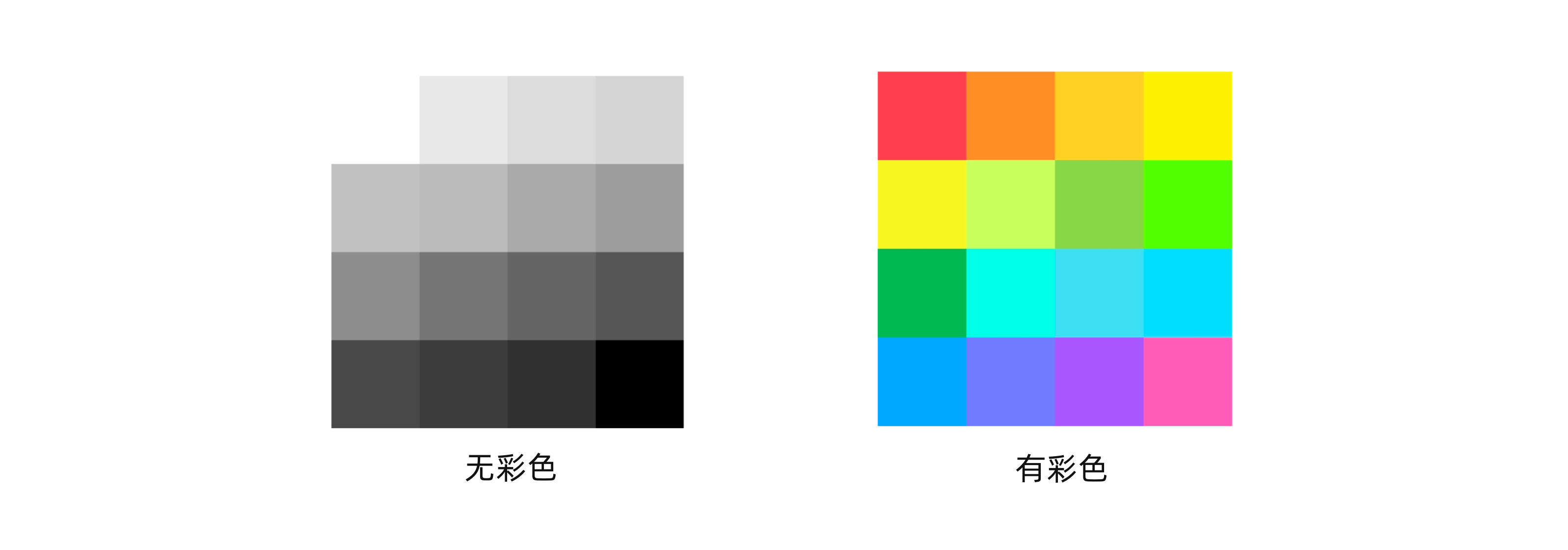 色彩大体上可以分为有彩色和无彩色两类,无彩色是指黑、白、灰这三种没有色相属性和纯度属性的颜色,有彩色是指拥有色彩三属性的全部颜色。