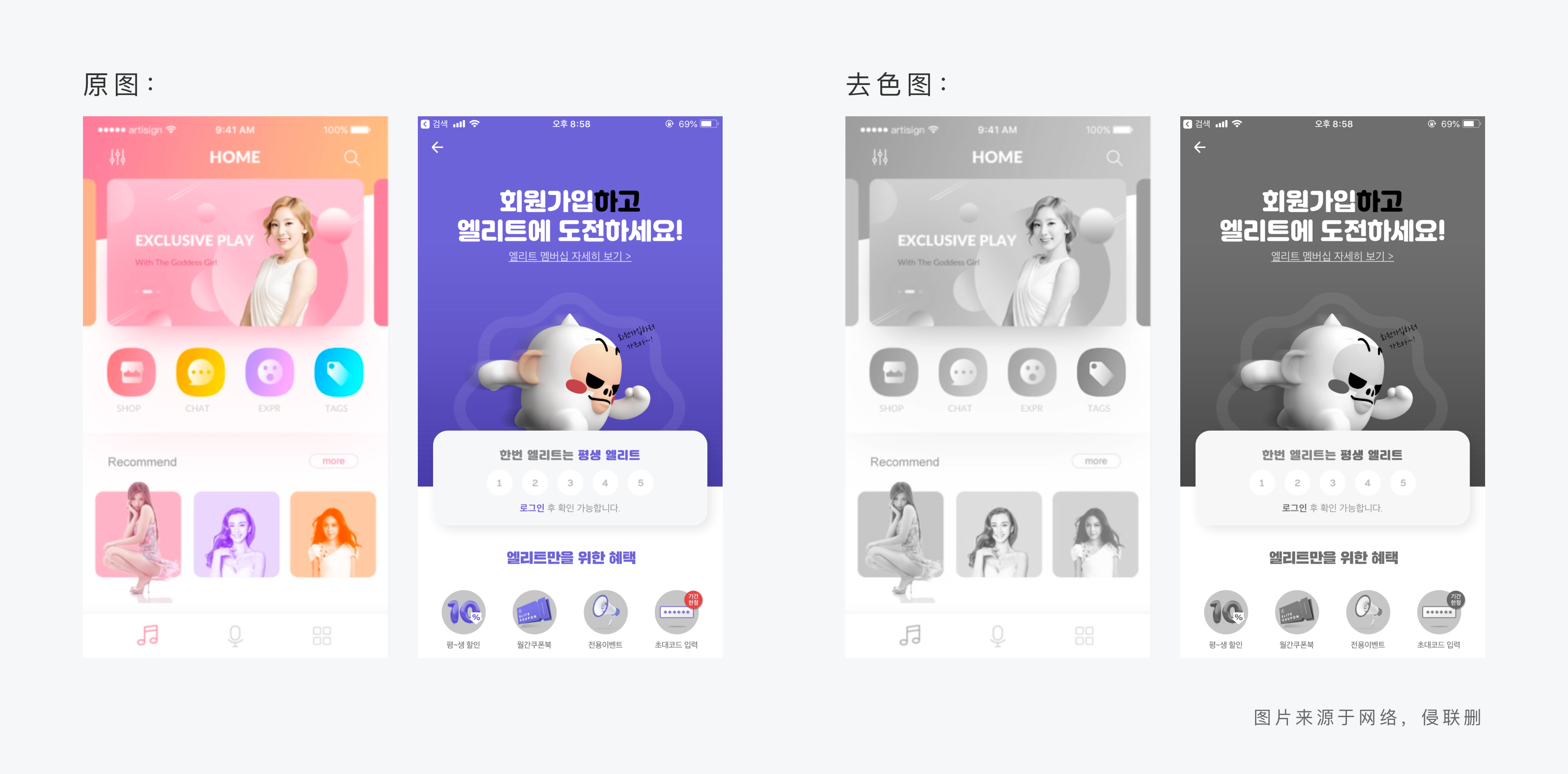 谈了很多配色方法,那么我们在设计中如何检验自己的设计图的配色是否合适呢?在这里我分享一个自己的检验方法,就是将自己的设计图进行去色处理,分析画面的色彩对比关系,保证整个页面的色彩比例和画面的中心突出。