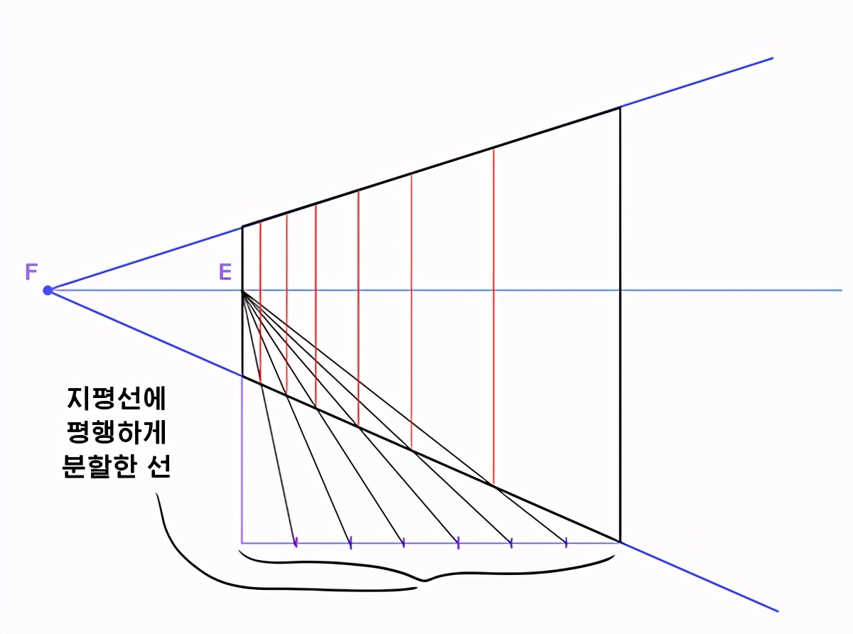 如图所示,通过将从点E延伸的平行线(包括水平线)分开,可以基于连接到点F时出现的交点将透视图的面分成相等的部分。当分割数很大时,这很方便。