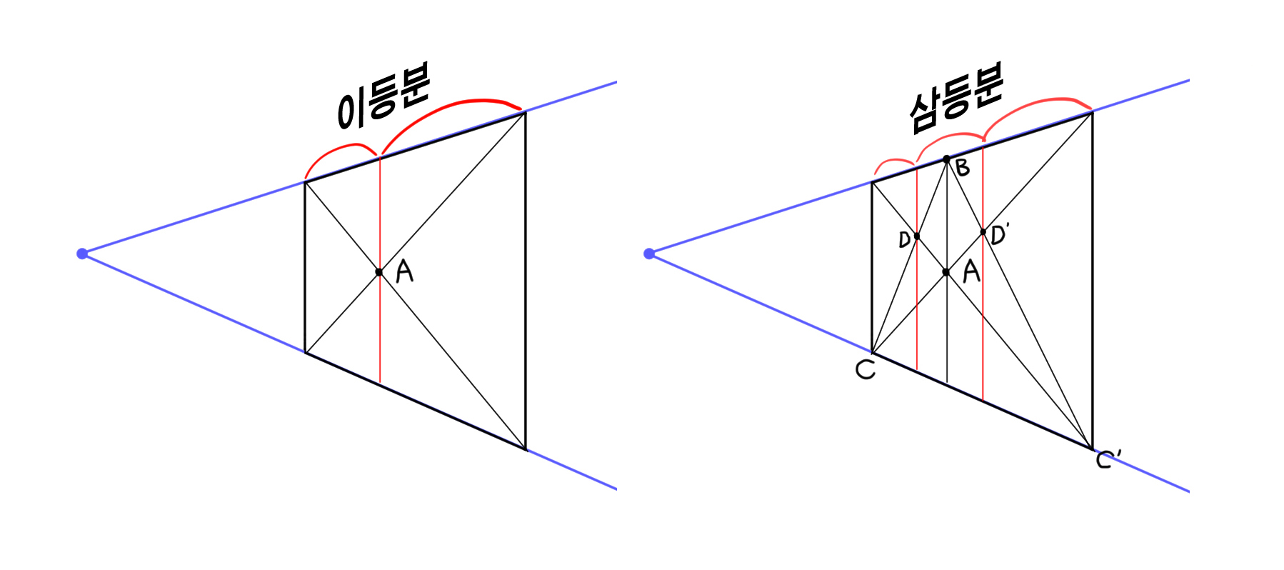 如果连接点B和角度(点C,点C')并通过基于与初始绘制的对角线相交的点D和D'画一条线对其进行划分,则它将成为第三个。