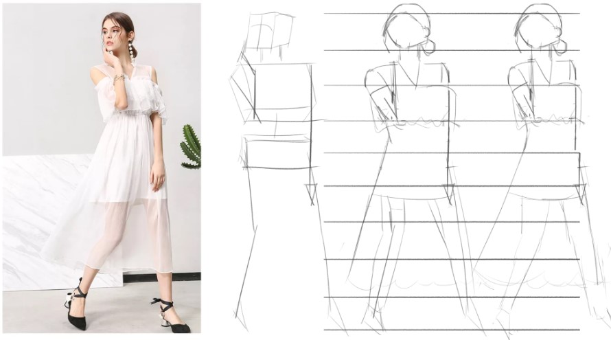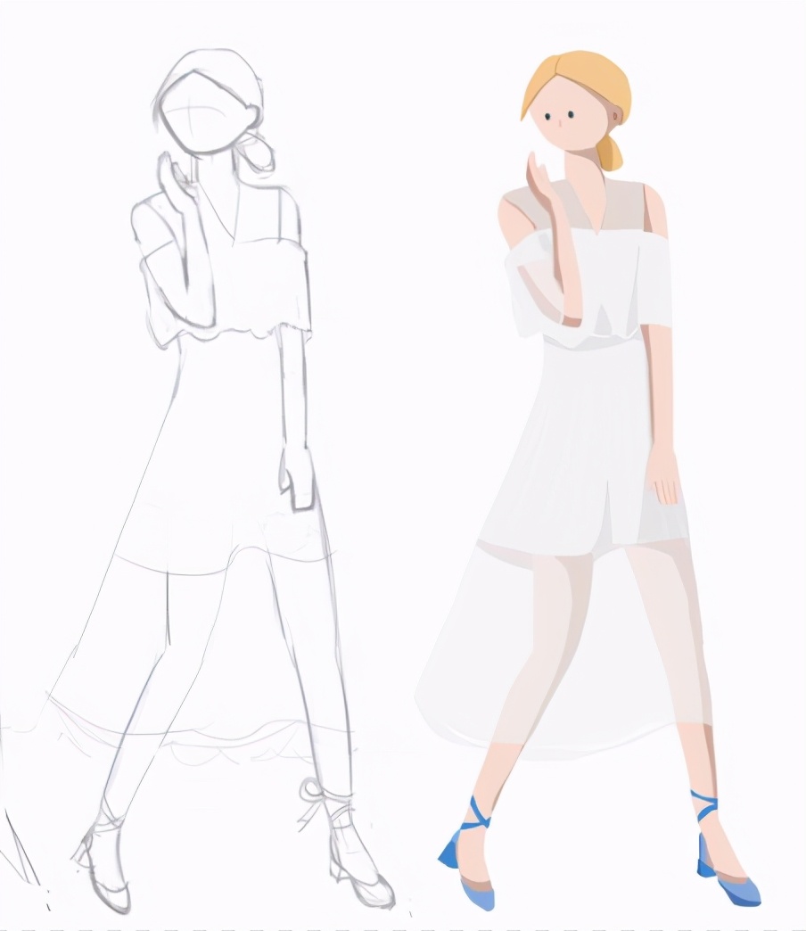 把腿拉长,拉长1个头,再把拉长腿的线稿,缩小到原来的尺寸,会发现高高瘦瘦的大长腿姐姐出现了。