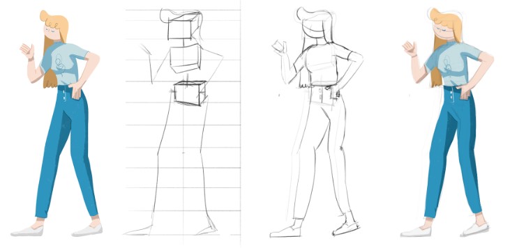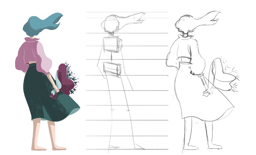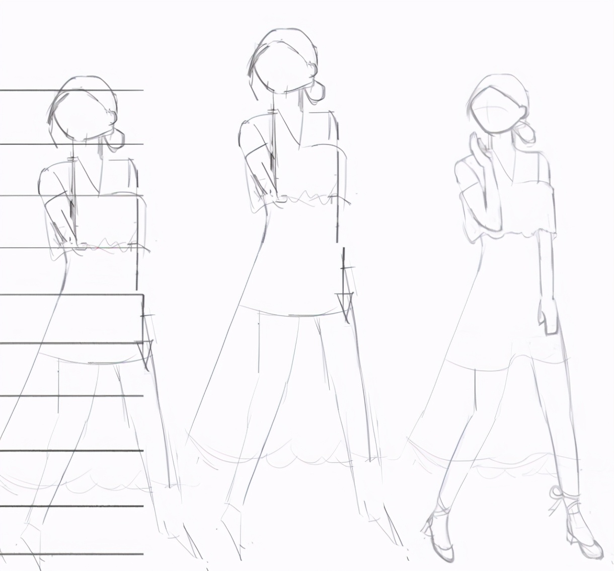 粗略的画几条平行线,发现这个插画师的插画人物比例都是9.5头身。其中头发0.5个头。把身体体块画出来,可以确定四肢的确切位置。就可以画出线稿。